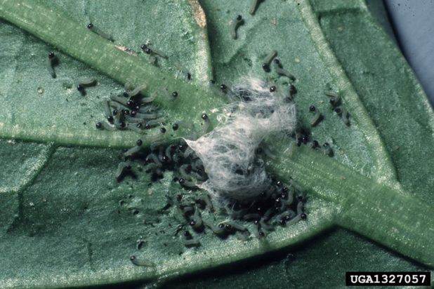 • Images by William Lambert, University of Georgia, Bugwood.org (larvae feeding on underside of leaf)