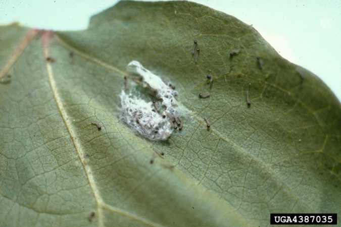 - Images by William Lambert, University of Georgia, Bugwood.org (larvae on leaf, male adult, and eggs hatching)