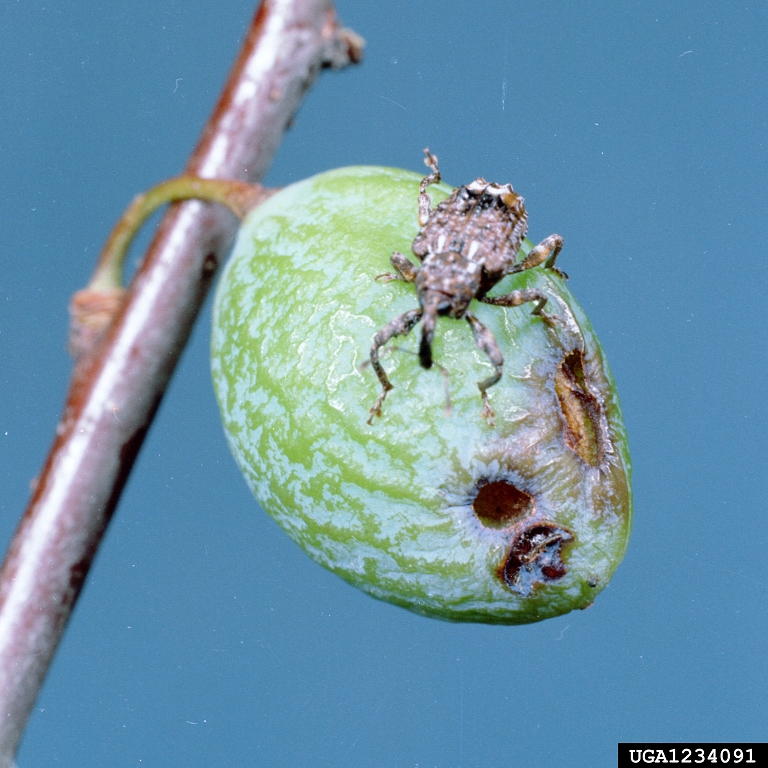 - Adult… (4-5 Weeks) Small, brownish-black beetle with small, curved snout extending from the head that is used for making punctures to feed and lay eggs. There are 4 distinguishing black bumps on its back. Approx. 6 mm. in length. Female can lay 60-150 eggs in lifetime and begins when fruit reaches adequate size to support larval development.